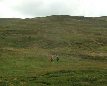 The remains of these roundhouses are often seen as circular depressions in the ground - the previous living area - usually surrounded by the low circular mound. The image above shows a single hut circle, covered in heather and enclosed within a post and wire fence. Now protected from grazing animals, the features seen in previous surveys are now obscured by exuberant vegetation. The image from Perth to the right shows a scattering of hut circles in a grazed landscape where they stand out more from the landscape.